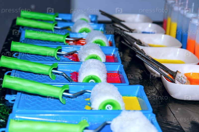 На столе много цветных красок и кисточек. Масштабный рисунок. Краски в тюбиках и тарелках
