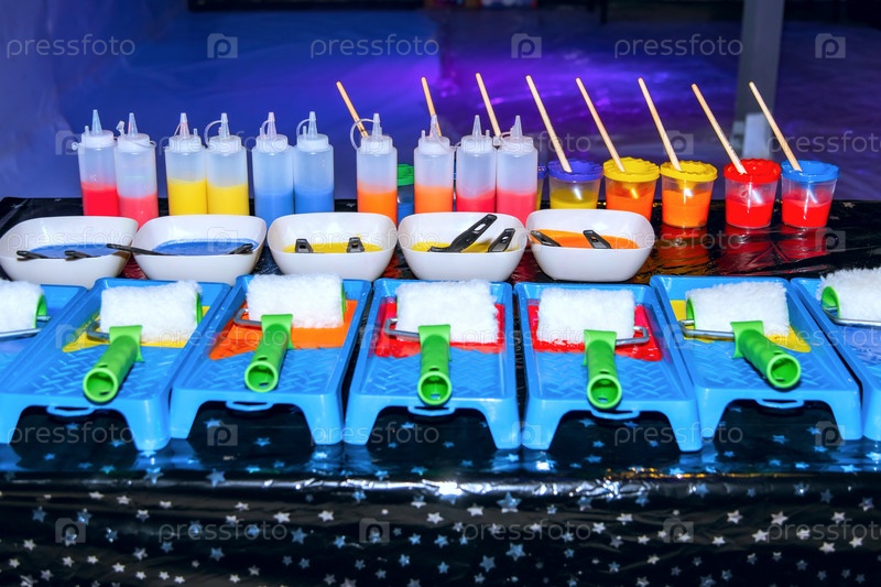 На столе много цветных красок и кисточек. Масштабный рисунок. Краски в тюбиках и тарелках