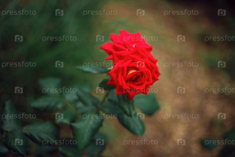 Цветок розы крупным планом на фоне клумбы. Концепция природы и улицы. Крупный план