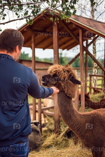 Мужчина кормит альпаку на ферме. Альпака в загоне