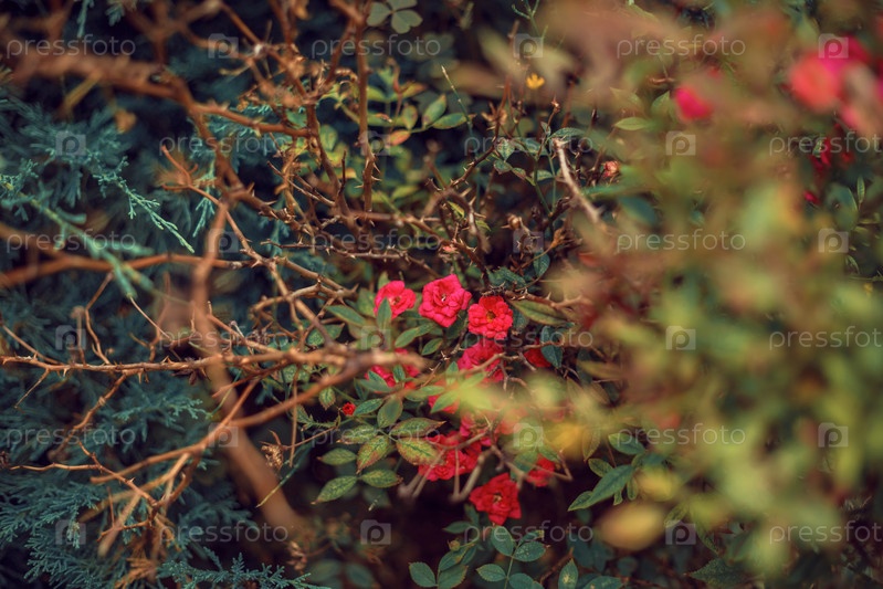 Розовые розы на стеблях в саду, окруженные шипами. красивые розовые цветы.Концепция природы и улицы. Крупный план