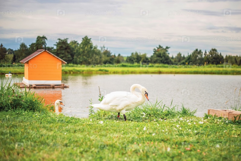 Пруд с семейством лебедей. Летний день над прудом. Красивая зеленая территория. Лебеди в озере