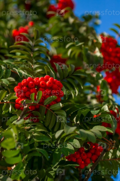 Рябина летом. Голубое небо на фоне ярких ягод. Природная открытка
