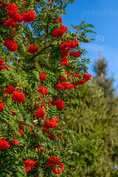 Рябина летом. Голубое небо на фоне ярких ягод. Природная открытка