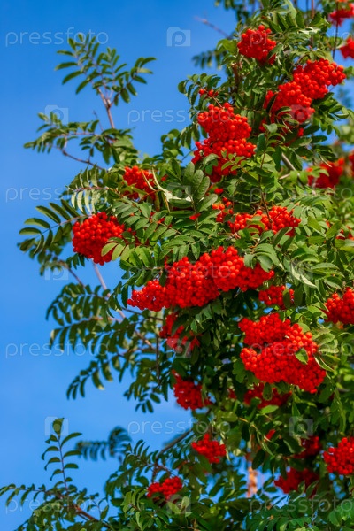 Рябина летом. Голубое небо на фоне ярких ягод. Природная открытка