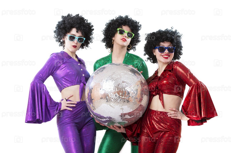 Группа девушек, одетых в стиле диско в блестящие разноцветные костюмы, держат диско-шар