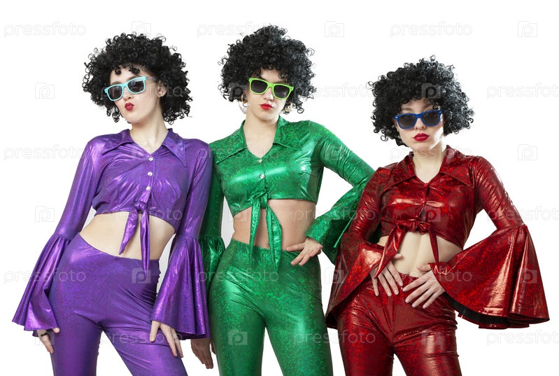 Группа девушек-диско в афроамериканских париках и красочных костюмах на белом фоне. Мода семидесятых и восьмидесятых