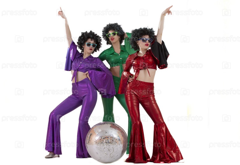 Группа девушек в стиле диско, с диско-шаром, вечеринка в честь Хэллоуина, на белом фоне