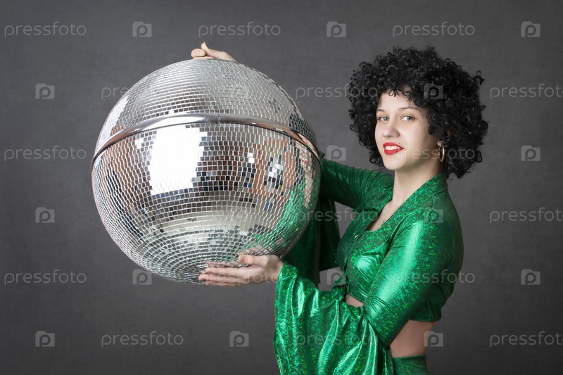 Счастливые девушки в стиле диско, с диско-шаром, вечеринка в честь Хэллоуина, на сером фоне. Тематическая вечеринка в стиле 80-х