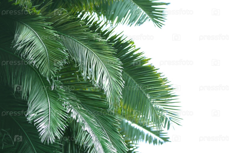 Тропические пальмовые листья на белом фоне. Экзотический растительный фон