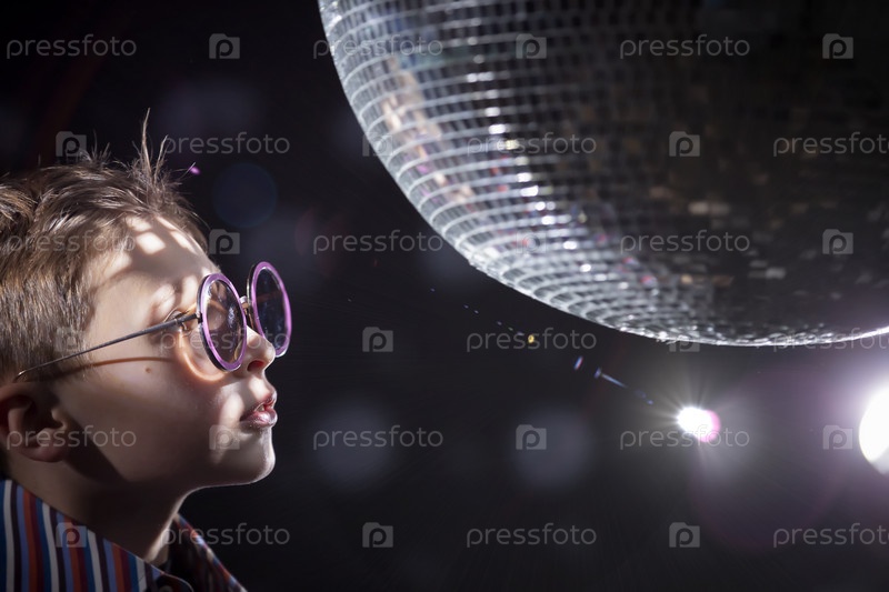 Мальчик в очках смотрит на вращающийся диско-шар. Детская дискотека, вечеринка