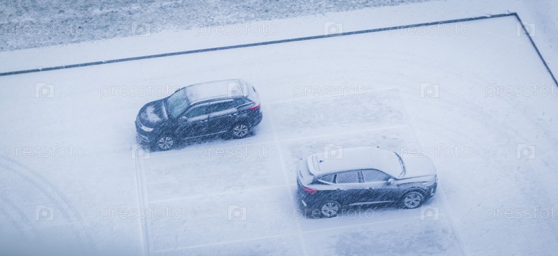 Автомобили на парковке во время сильного снегопада. Сезон