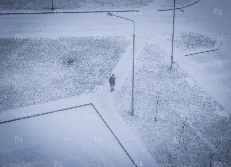 Женщина ходит и разговаривает по телефону во время сильного снегопада, Сезон