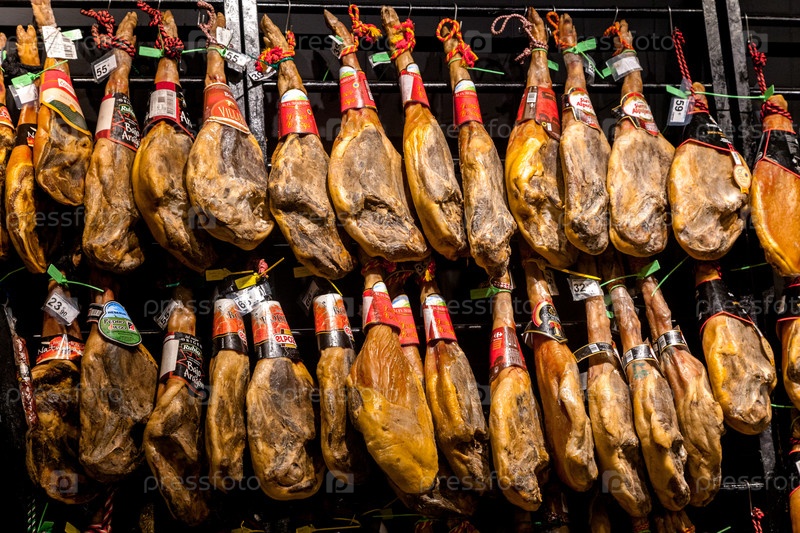 САНТЬЯГО-ДЕ-КОМПОСТЕЛА, ИСПАНИЯ - 01 мая 2015 г. - Хамон в магазине