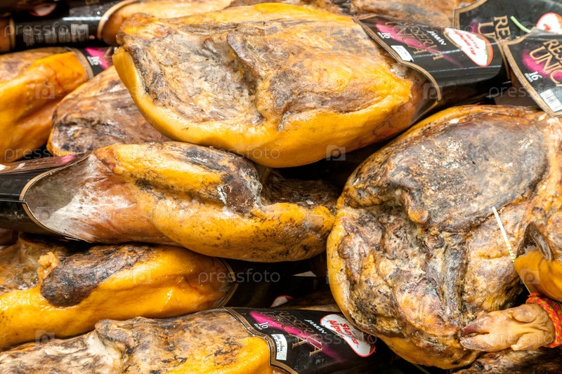 САНТЬЯГО-ДЕ-КОМПОСТЕЛА, ИСПАНИЯ - 01 мая 2015 г. - Хамон в магазине