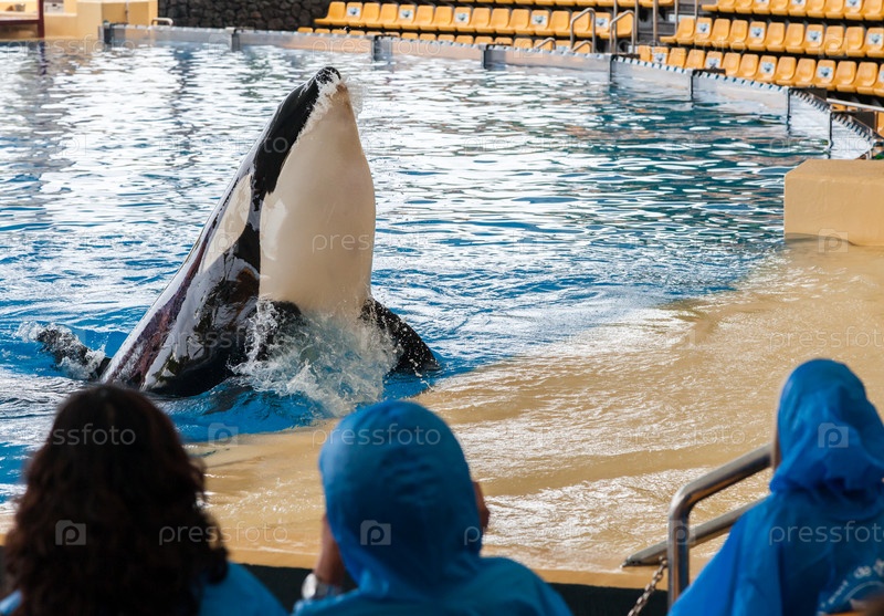 ПУЭРТО-ДЕ-ЛА-КРУС, ОСТРОВ ТЕНЕРИФЕ, ИСПАНИЯ - 12 декабря 2015 г. - Дрессированные косатки выступают перед туристами