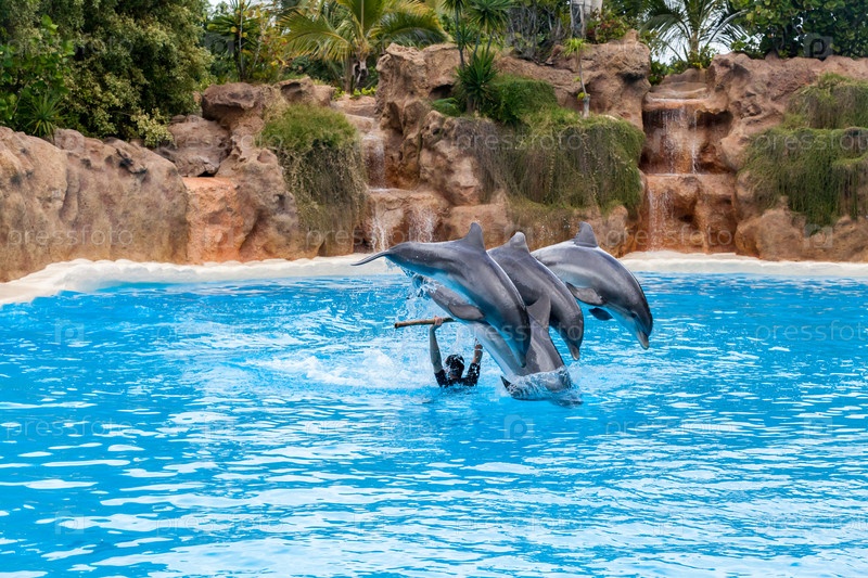 ПУЭРТО-ДЕ-ЛА-КРУС, ОСТРОВ ТЕНЕРИФЕ, ИСПАНИЯ - 12 декабря 2015 г. - Дрессированные дельфины выступают на водном шоу