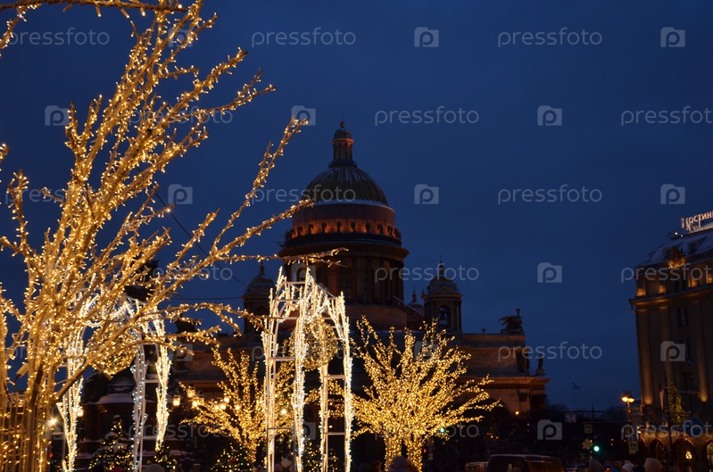 Вид на Исаакиевский собор на фоне новогодних украшений зимнего сада на Синем мосту через реку Мойка в Санкт-Петербурге