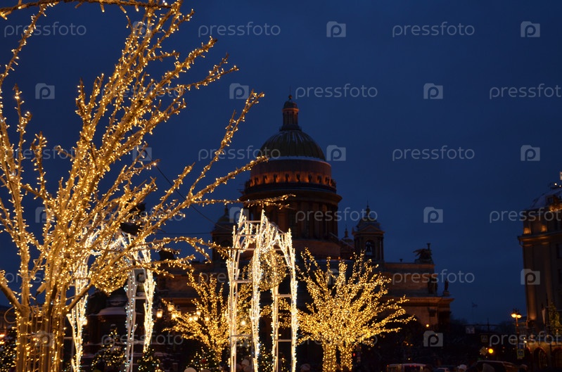 Вид на Исаакиевский собор на фоне новогодних украшений зимнего сада на Синем мосту через реку Мойка в Санкт-Петербурге