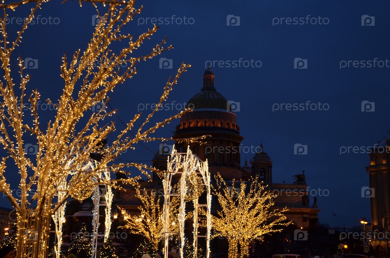 Вид на Исаакиевский собор на фоне новогодних украшений зимнего сада на Синем мосту через реку Мойка в Санкт-Петербурге