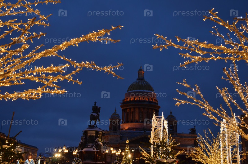 Вид на Исаакиевский собор и памятник царю Николаю I на фоне новогодних украшений зимнего сада на Синем мосту через реку Мойка в Санкт-Петербурге