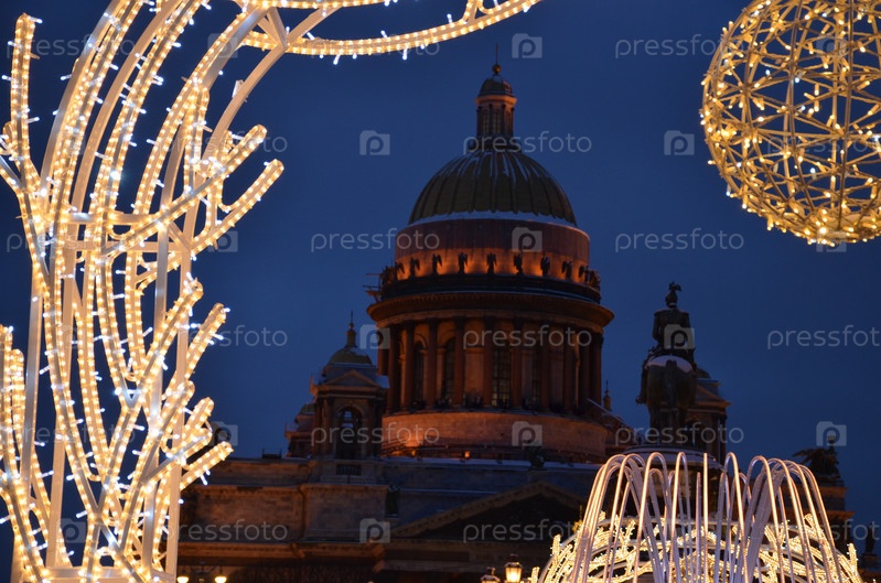 Вид на Исаакиевский собор и памятник царю Николаю I на фоне новогодних украшений зимнего сада на Синем мосту через реку Мойка в Санкт-Петербурге