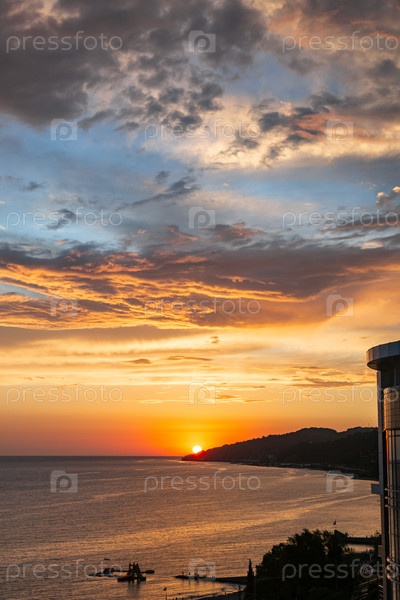 Вдалеке виден большой водоем с видом на городской пейзаж на закате