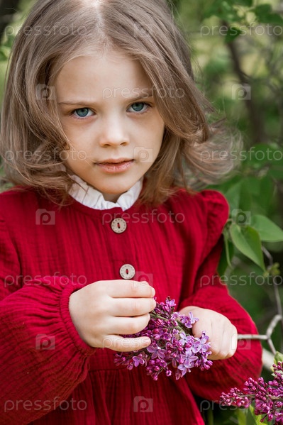 Весеннее цветение. Портрет красивой 5-летней девочки в красном платье в сиреневом саду на природе. Детство