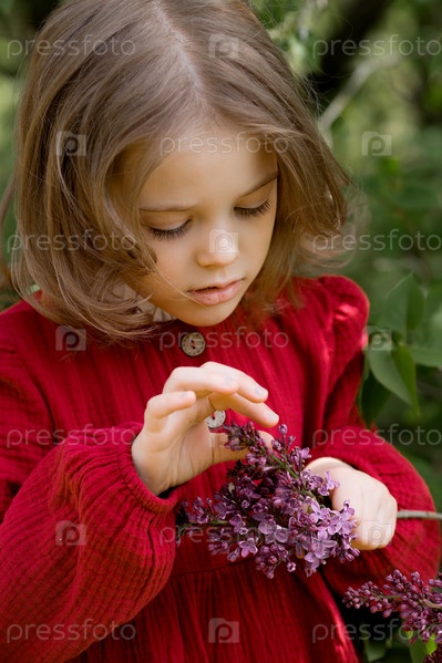 Весеннее цветение. Портрет красивой 5-летней девочки в красном платье в сиреневом саду на природе. Детство