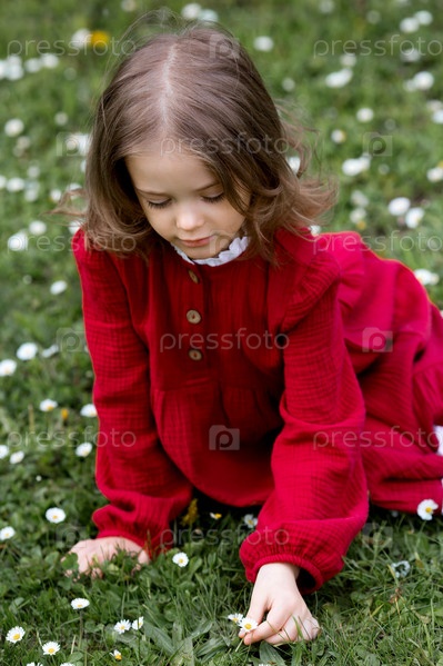 Весеннее цветение. Портрет красивой 5-летней девочки в красном платье в цветущем саду на природе. Детство