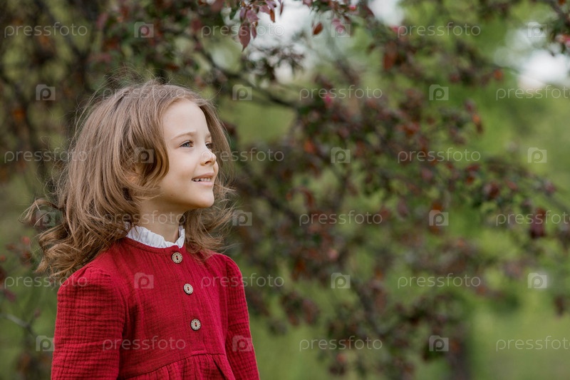 Весеннее цветение. Портрет красивой 5-летней девочки в красном платье в цветущем саду на природе. Детство
