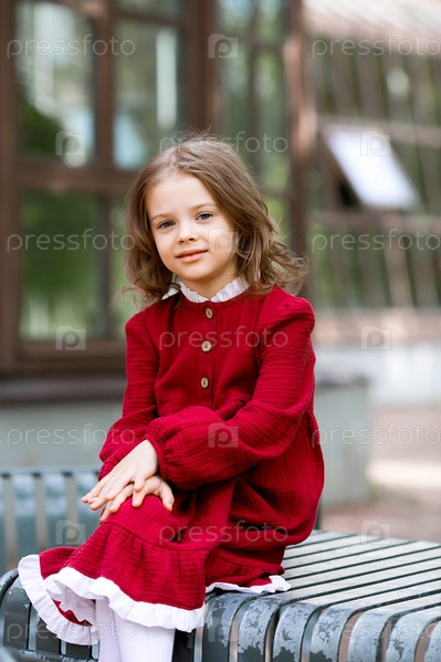 Портрет красивой 5-летней девочки в красном платье в парке. Детство