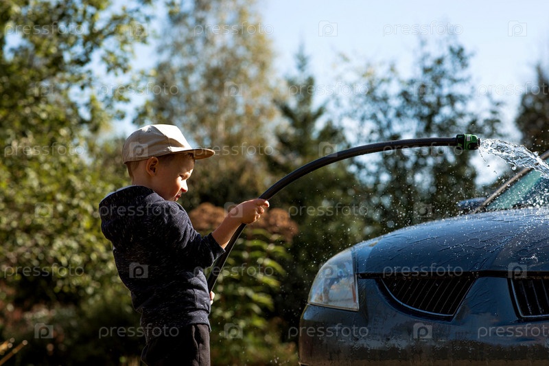 Маленький мальчик моет машину на улице. Счастливый здоровый малыш моет машину водой из шланга, весело плескаясь