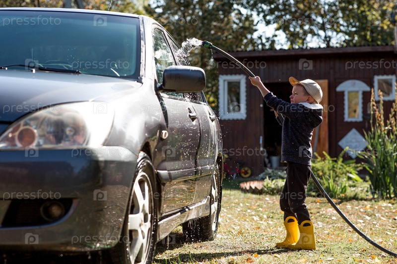 Маленький мальчик моет машину на улице. Счастливый здоровый малыш моет машину водой из шланга, весело плескаясь