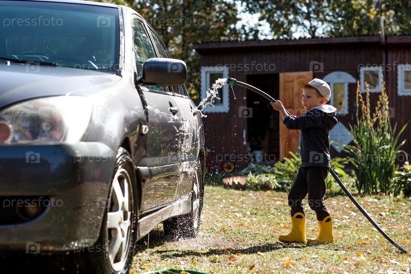 Маленький мальчик моет машину на улице. Счастливый здоровый малыш моет машину водой из шланга, весело плескаясь