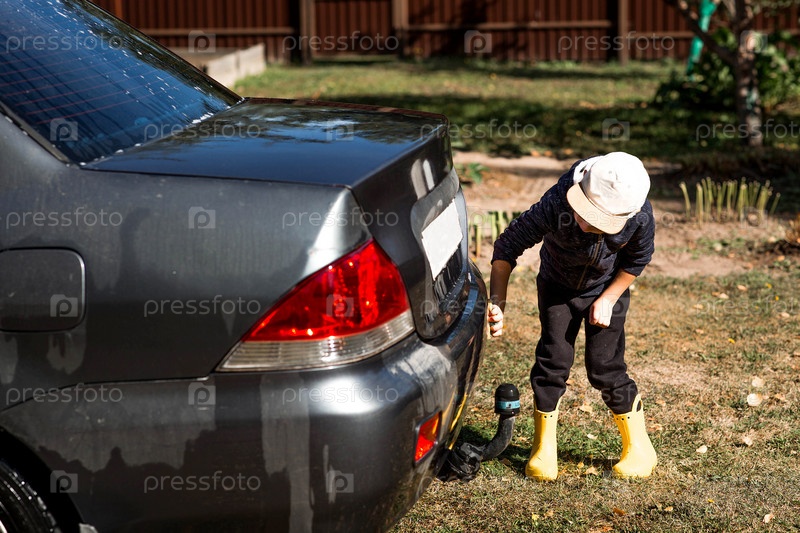 Маленький мальчик моет машину на улице. Счастливый здоровый малыш моет машину водой из шланга, весело плескаясь