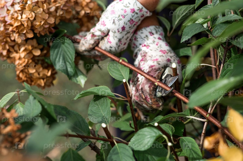 Осеннее садоводство. Садовник использует секатор. Обрезка кустов гортензии секатором после цветения. Уход за цветами на даче и в саду