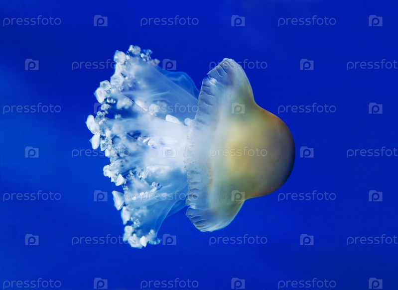 Крупный план белой медузы на синем фоне