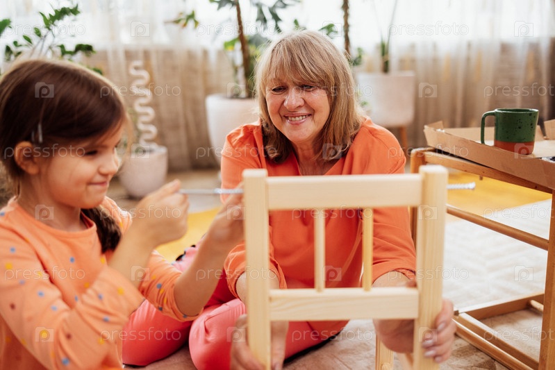 Пожилая женщина в повседневной одежде и ее маленькая внучка собирают новый деревянный стул