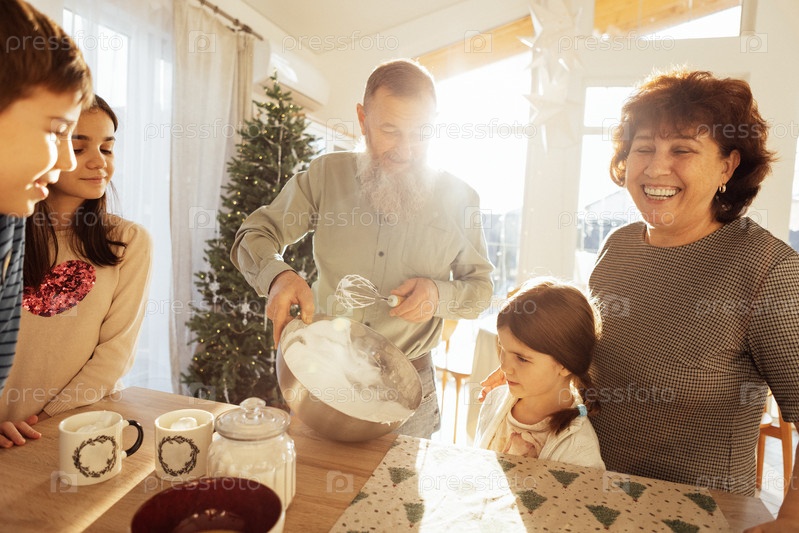 Большая счастливая семья готовит и веселится вместе дома
