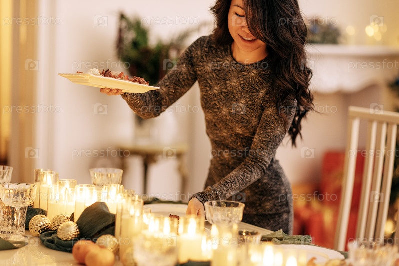 Привлекательная молодая азиатская девушка накрывает праздничный стол с новогодними украшениями и зажженными свечами