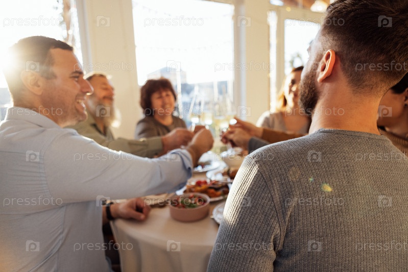 Счастливая большая семья за обеденным столом в столовой дома