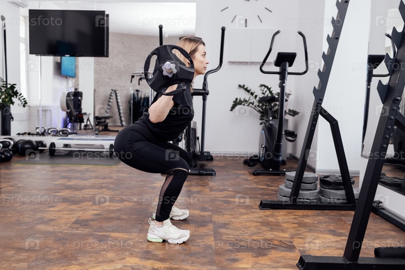 Напряженная симпатичная спортсменка в черной спортивной одежде поднимает штангу