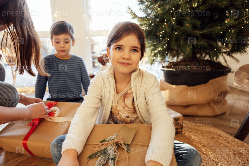 Крупный план милой маленькой девочки в свитере с подарком под украшенной рождественской елкой дома. Милые брат и сестра открывают подарки в гостиной
