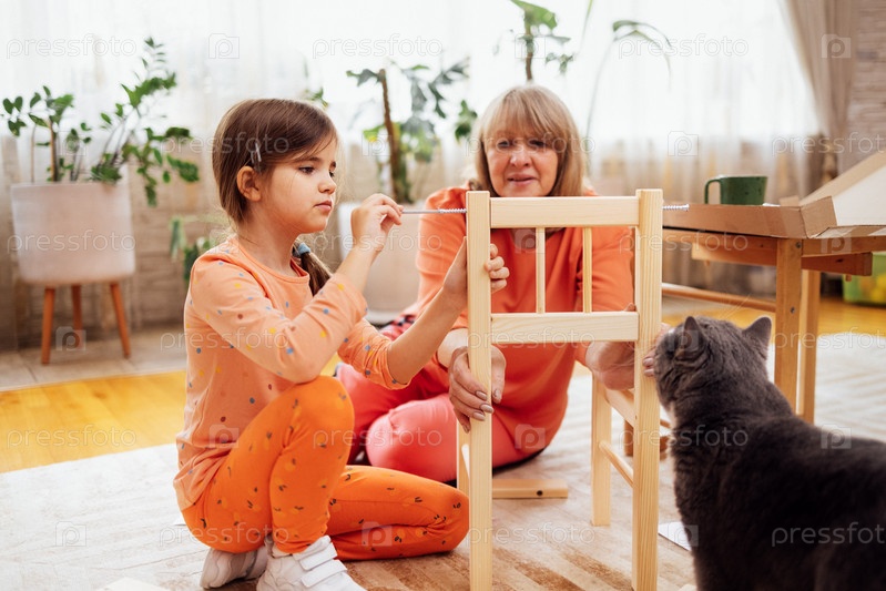 Пожилая женщина в повседневной одежде и ее маленькая внучка собирают новый деревянный стул