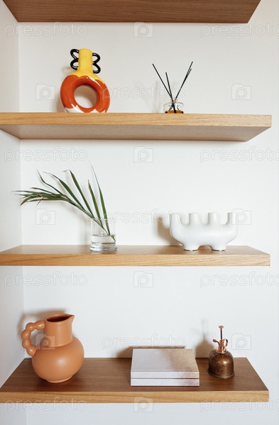 Детали стильного интерьера дома крупным планом. Деревянные полки с вазами и кувшинами ручной работы