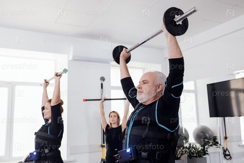 Пожилая пара занимается электростимуляцией мышц с персональным тренером в фитнес-клубе