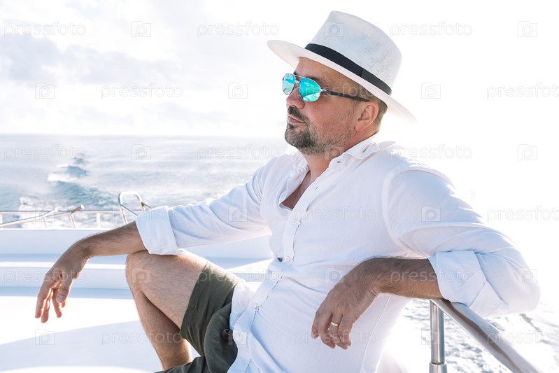 Молодой человек в белой рубашке и шляпе сидит на борту лодки. Турист в солнцезащитных очках и повседневной одежде наслаждается морским пейзажем