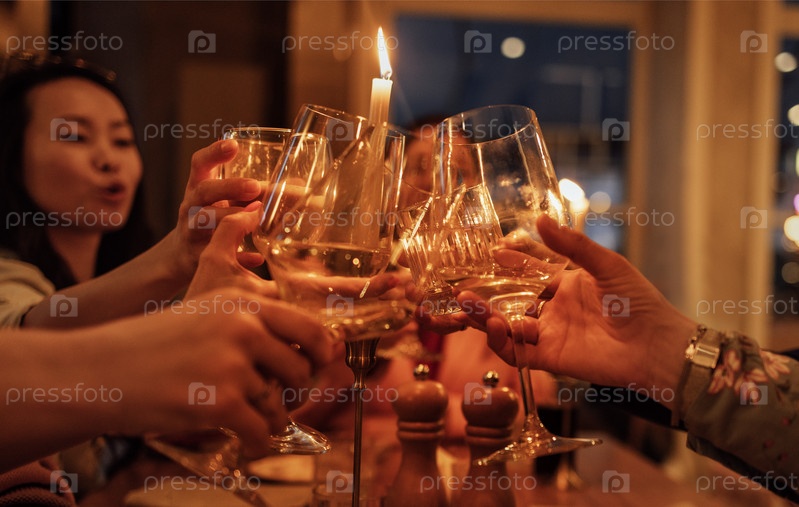 Женские руки с бокалами шампанского. Молодые женщины произносят тост и поднимают бокалы игристого вина в ресторане. Девушки чокаются бокалами алкогольных напитков в кафе