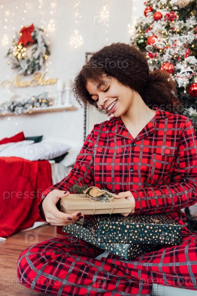 Молодая улыбающаяся африканская женщина сидит на полу и распаковывает подарки под елкой